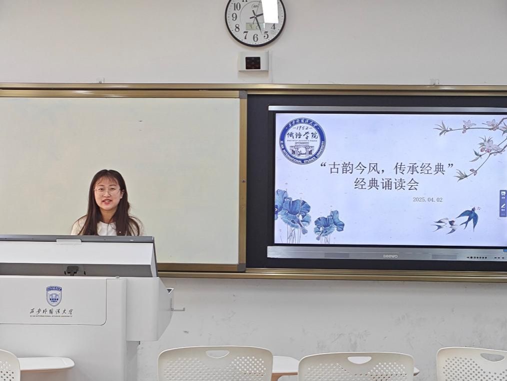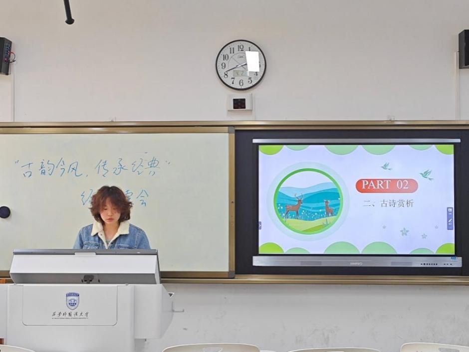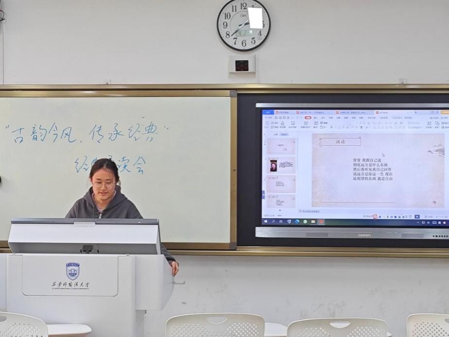 在JA107教室举办“古韵今风,传承经典”经典诵读会,研一部分学生参加活动,活动由研究生会学生干部谭雅玲同学主持。