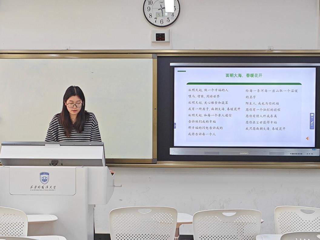 诵读会在悠扬的音乐声中拉开帷幕,2024级研究生张悦首先朗诵了海子的《面朝大海,春暖花开》,她用温柔而坚定的声音描画诗中“从明天起,做一个幸福的人”的恬静自然意境,深深触动了在场听众。海子对平凡生活的诗意描绘,让同学们的心灵在繁忙的学业中得到片刻停留,静静体会生活的美好。