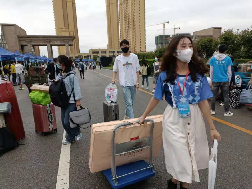 志愿者在现场老师的统一指导下分批有序的帮助新生完成信息核对、注册登记、领取相关材料等手续,而后,帮助新生将行李搬运至各宿舍。