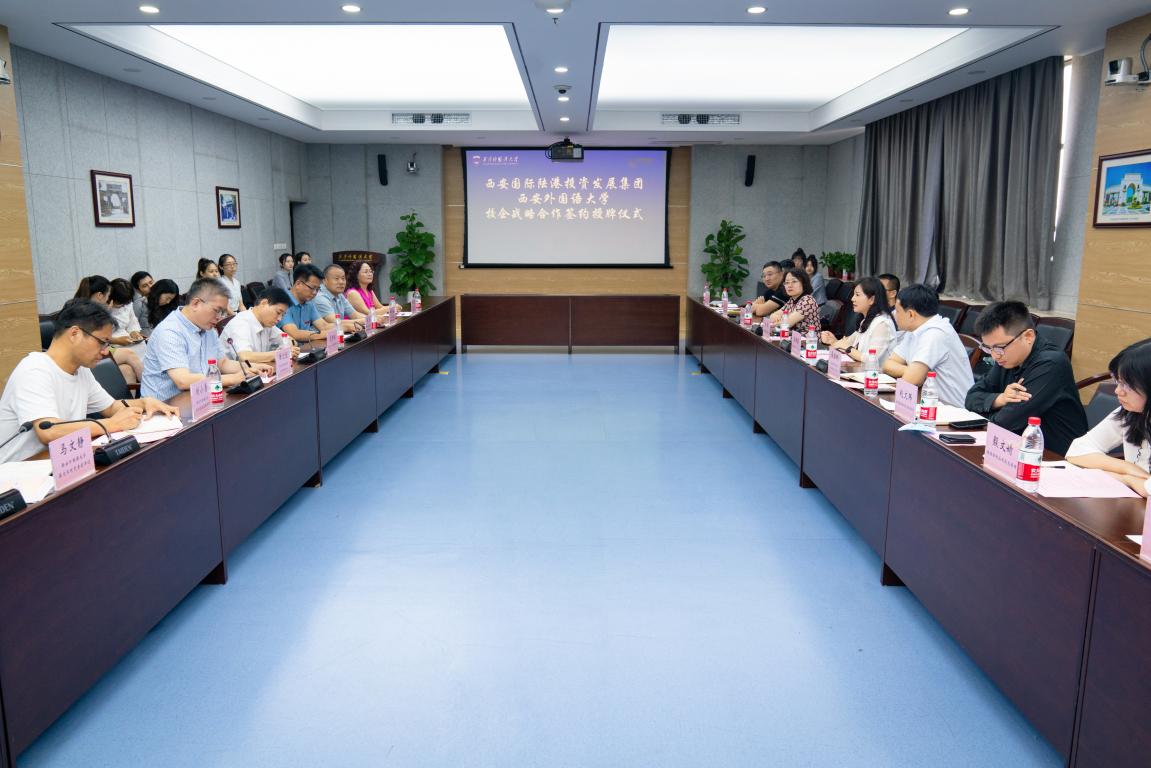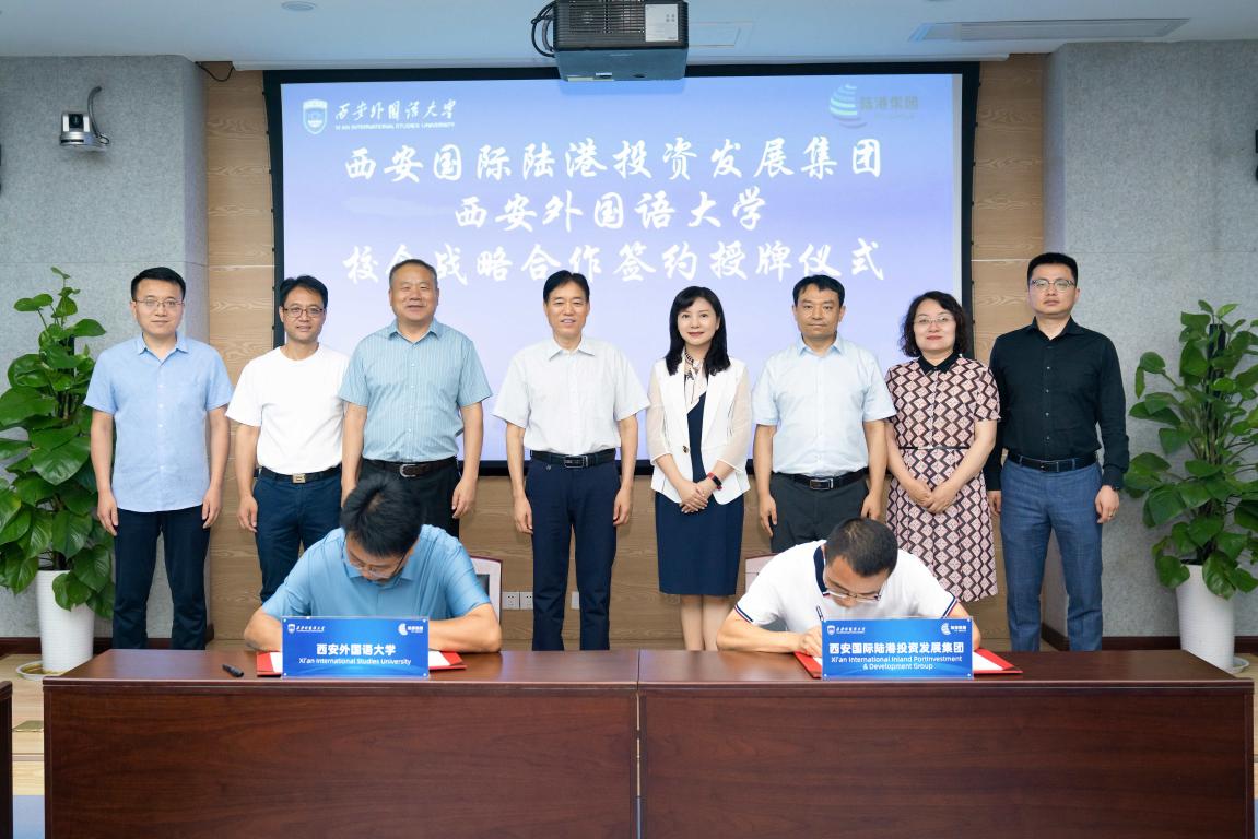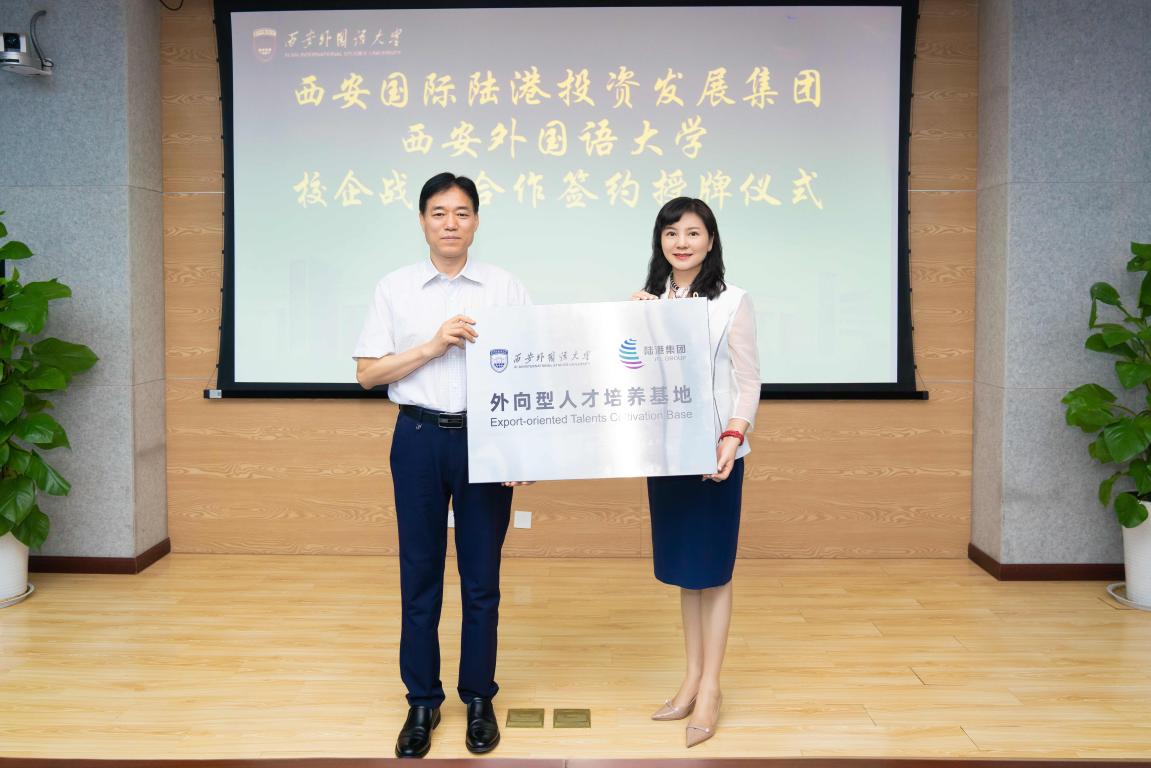 西安国际陆港投资发展集团副总经理、西安国际陆港物贸公司总经理肖伟、我校教务处卓越创新学院副院长吕斌共同签署共建实习基地协议。党争胜代表我校向西安国际陆港投资发展集团授牌。