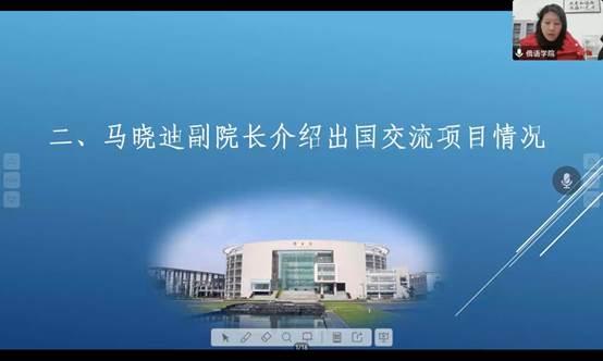 马晓迪副院长为大家介绍了出国留学项目的情况。学院目前与国外16所高校有签署合作协议,涵盖俄罗斯、哈萨克斯坦、白俄罗斯等国家,合作高校包括俄罗斯普希金学院、俄罗斯莫斯科国立语言大学、俄罗斯人民友谊大学等。马晓迪还就其中一些国外高校的学费、生活费以及申请要求等作了详细介绍。她指出疫情政策放开之后,对外语专业毕业生出国深造带来机遇。