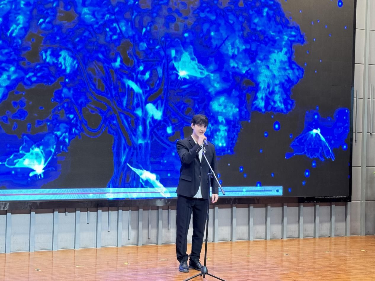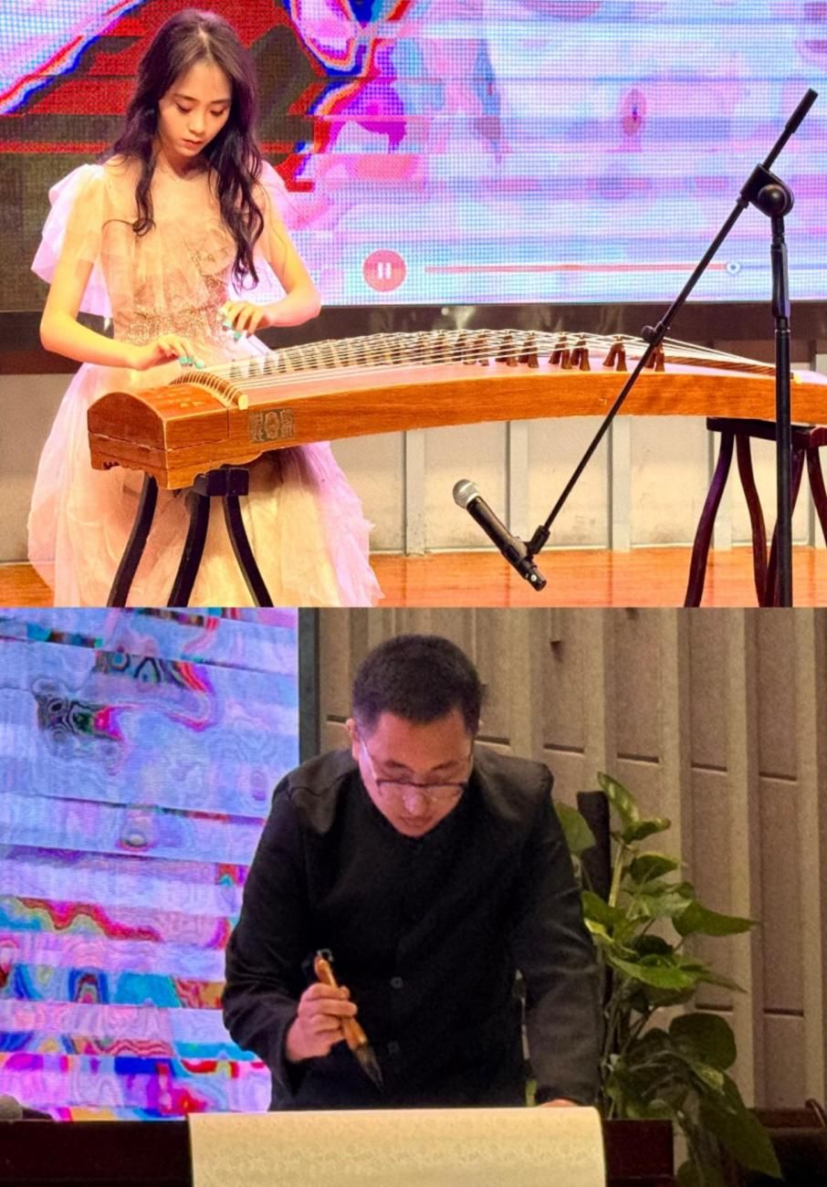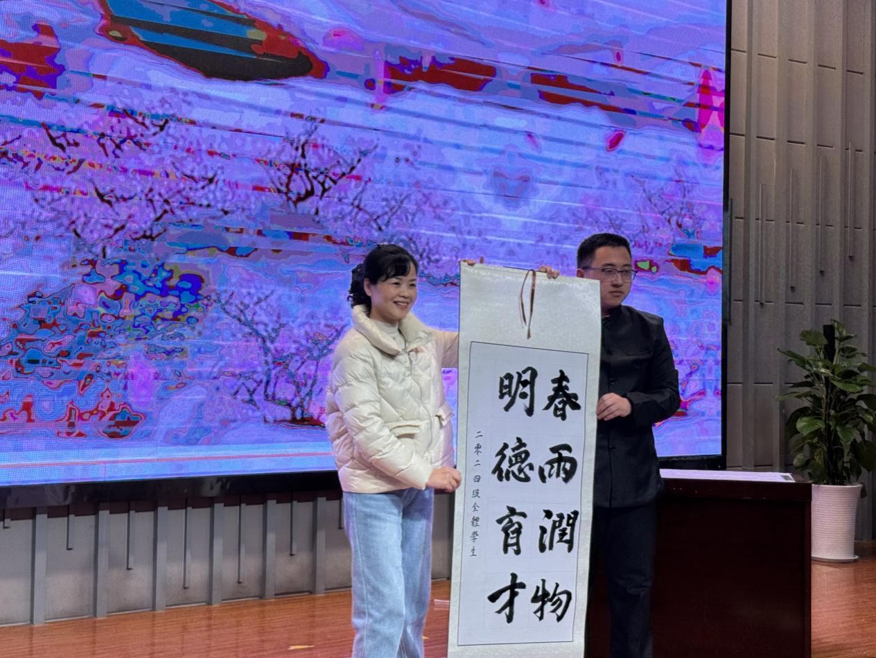 音乐类节目精彩频出,歌曲《我们的明天》唱出了对未来的憧憬,歌声悠扬动人;节目《古筝弹奏与书法表演》更是别出心裁,将古典音乐与书法艺术完美结合,展现了传统文化的魅力。作者代表2024级向学院赠送书法作品,表达全体学生对学院栽培的感恩之情,教师代表上台表示感谢并送去谆谆寄语。