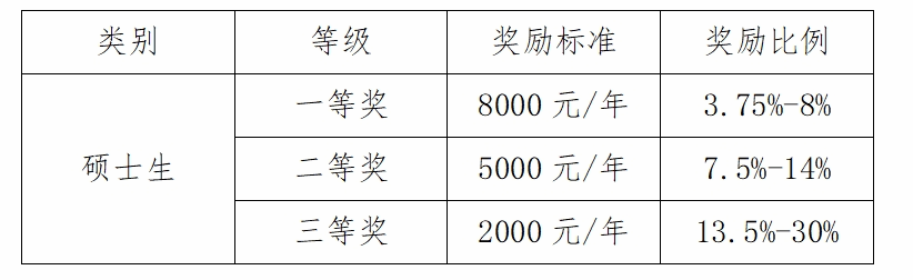 第六条研究生学业奖学金分为一等奖、二等奖和三等奖等三个等级,具体奖励等级、标准和比例为: