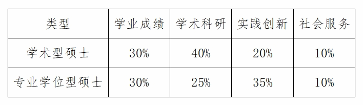 研究生综合测评实施细则(2024修订)》),考核项目分为“学业成绩”“学术科研”“实践创新”“社会服务”,各项权重比例如下: