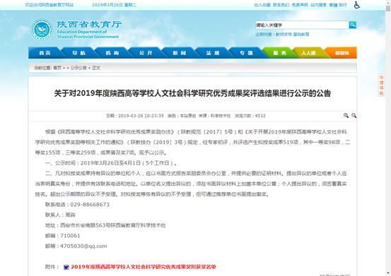3月26日早,陕西省教育厅发布《关于对2019年度陕西高等学校人文社会科学研究优秀成果奖评选结果进行公示的公告》。公告对2019年度陕西高等学校人文社会科学研究优秀成果奖拟获奖名单进行了公示,色花堂 教师林...