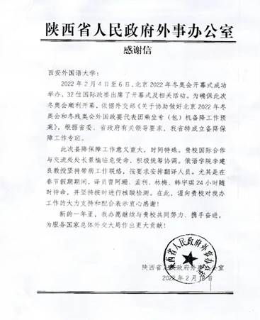 2022 .05 .27陕西省人民政府外事办公室就我校教师助力北京2022年冬奥会开幕式发来感谢信