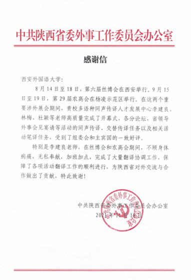 2022 .11 .21中共陕西省委外事工作委员会办公室向我校致感谢信