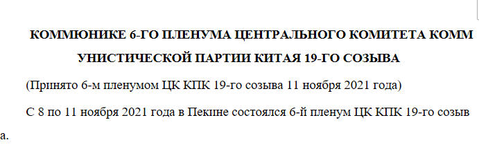 КОММЮНИКЕ 6-ГО ПЛЕНУМА ЦЕНТРАЛЬНОГО КОМИТЕТА КОММУНИСТИЧЕСКОЙ ПАРТИИ КИТАЯ 19-ГО СОЗЫВА(Принято 6-м пленумо...